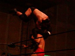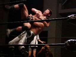 石川ロープに振って16文、柿本かわしてエクスプロイダーで投げる(右写真)、高木にタッチ。