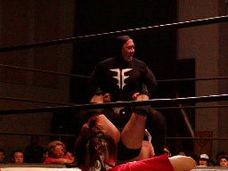 猪熊逆水平、キック、ボディスラムから逆エビ固め(右写真)、これは高木がカット。