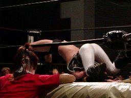 ポイズンコーナーでパンチ、キック連打。ロープに振ってラリアット、カウント2。ポイズン柿本にバックドロップ(左写真)、これも2。猪熊にタッチ。
