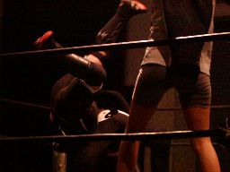 猪熊のラリアットは高木と相打ちに(右写真)。しかし猪熊すぐにもう一発、今度は高木を倒す、カバーはカウント2。猪熊バックドロップ、ポイズンにタッチ。