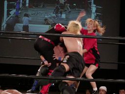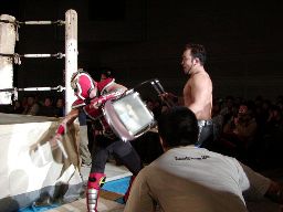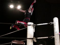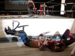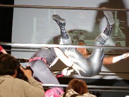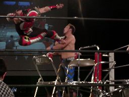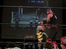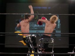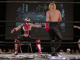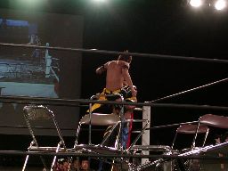 HERO!は諸橋を絞め上げてイスに座らせるが諸橋は2で立ち上がる(左写真)。HERO!再度諸橋をコーナーに上げて雪崩式フランケンシュタイナー狙う、が、諸橋がバランスを崩して場外に転落。