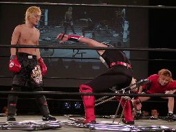 リングにイスが運び込まれる。中央の4つは立てた状態、その周りにさらに畳んだ状態のイスが多数。これじゃあロープに振るのも一苦労だな。さらに王者組は一脚ずつイス持参。先発は鳥羽とKUDO。KUDOハイキック(左写真)、飛びヒザ蹴りで鳥羽がイスに座る、カウント2で鳥羽ハネ上がる。