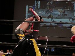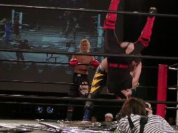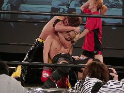 鳥羽キック、HERO!ブロックして逆にハイキック、フランケンシュタイナー(左写真)。KUDOにタッチ。