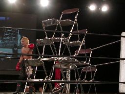 諸橋「待て待て、これは作戦ミスだ。こんな試合形式はやめればよかった。技かけてる方がいてーんだよ。もういいこんなデスマッチもうやりたくねーよ。こんな痛いデスマッチやっても俺たち勝っちゃうんだから。だいたい負けた人間がすぐに挑戦できるってのがこの会社フザケてるよな。」鳥羽諸橋の話聞かずイスを積んでいる。
