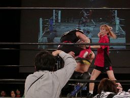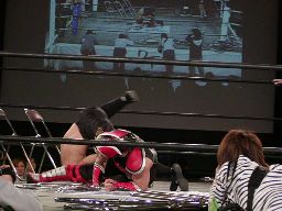 諸橋場外でイス攻撃(右写真)。HERO!は場外でクロスチョップ。5分経過。