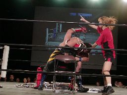 HERO!がイスを重ね、諸橋をコーナーに座らせて雪崩式フランケン狙う、諸橋急所打ち、リングに降りてHERO!をイスの上に投げっ放しパワーボム(左写真)。鳥羽にタッチ。