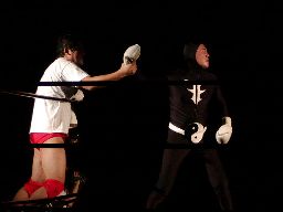 そして猪熊は戦いを続けようとする。蛇イアント思わず猪熊の手をつかむ。場内暗転(左写真)。