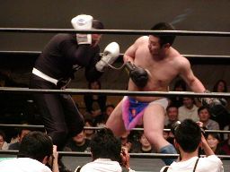 ディーノまたタックルで倒すと猪熊の欠場原因であった腰にパンチ(左写真)。猪熊立ち上がれなくなりダウンカウント入る。7でようやく立つ。ディーノはボディスラムから腰にストンピング。