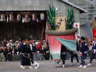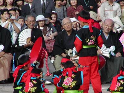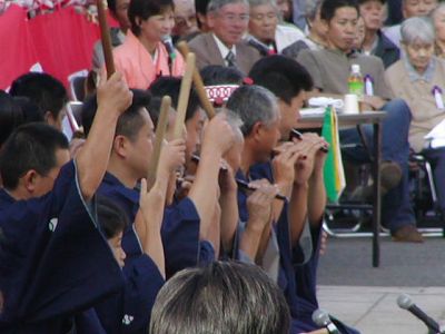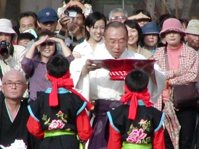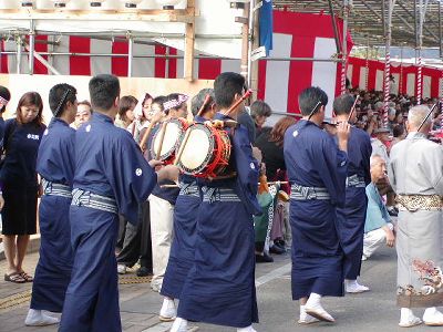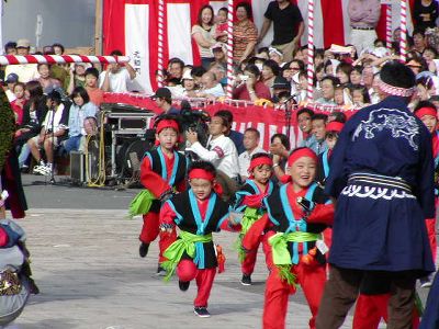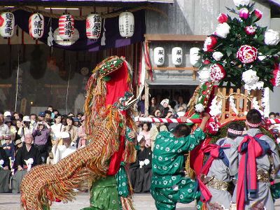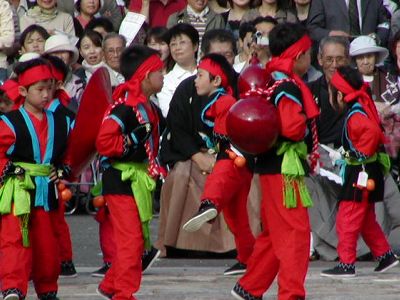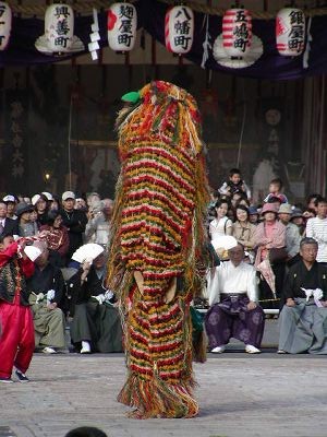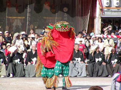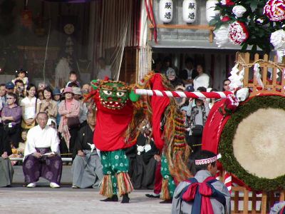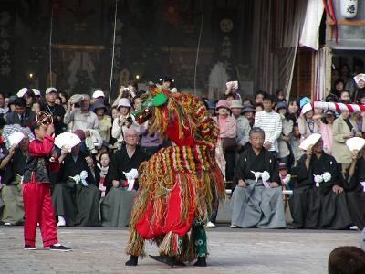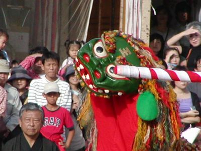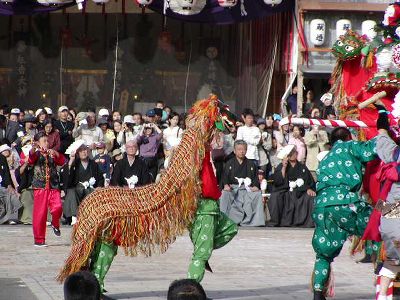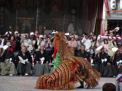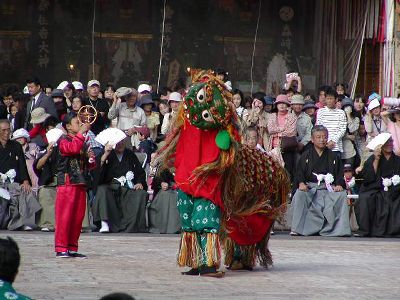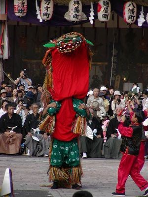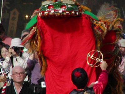 獅子。中尾獅子浮立だそうだ。今回は小川町の自治会長と中尾町の自治会長か誰かが同級生ということで実現したコラボレーションらしいが、元来長崎くんちはこういった近隣市町村の伝統芸能が参加していた。