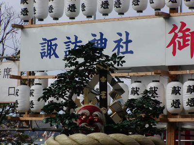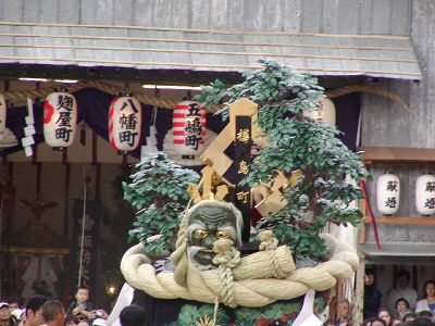 樺島町の傘鉾。赤・緑の猿田彦の面に榊の木と御幣。