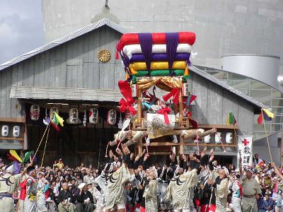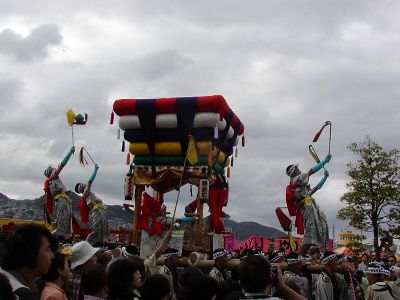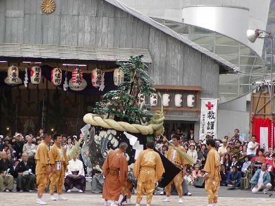 「コッコデショ、コッコデショ、コッコデショ」で太鼓山を投げ上げ、片手でキャッチ。