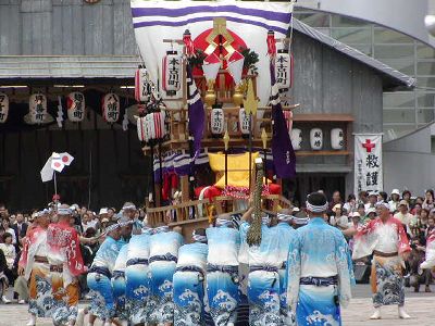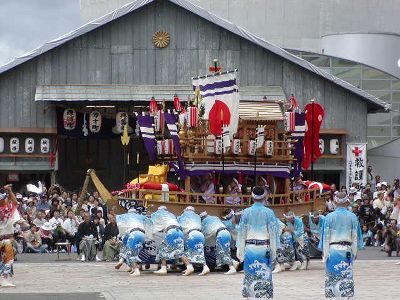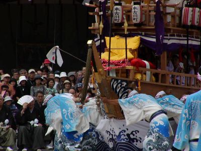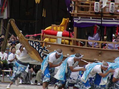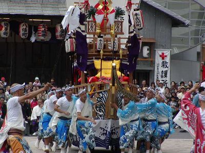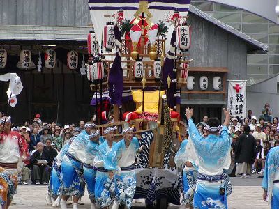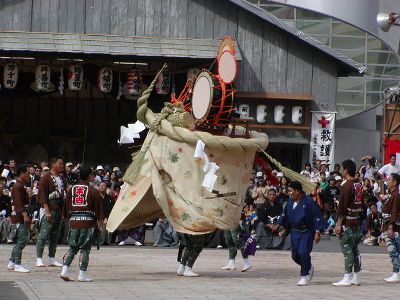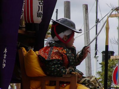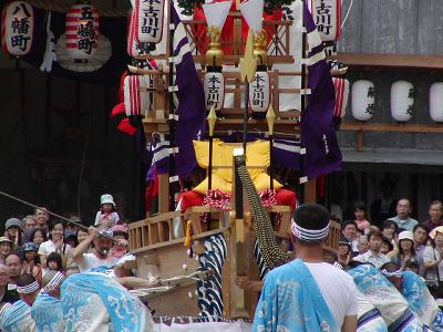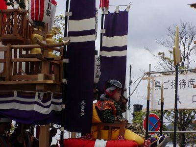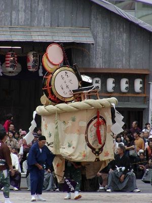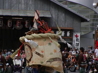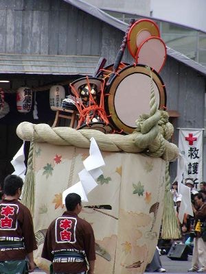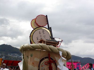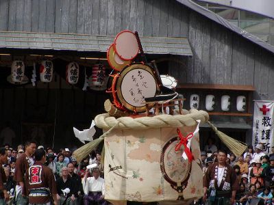 本古川町の傘鉾。飾は太鼓、鼓、笛など。輪は七五三、垂もやはり雅楽関連。
