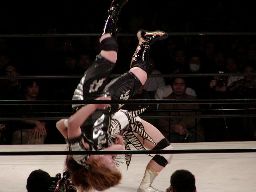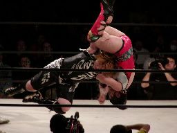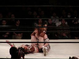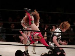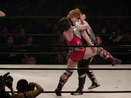 バックドロップ(右写真)は計3発、カウント2。ワキ固め、里村ロープ。