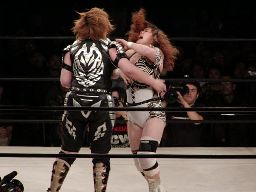 シュガーロープに振る、輝イナヅマ(左写真)。輝ロープに振る、シュガー切り返してチョークスラム、輝ブロック。