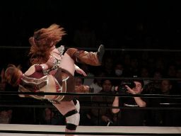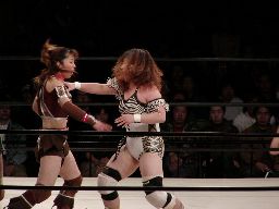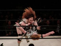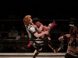 里村ローキック、アバランシュホールド(左写真)からV2アームロック、元気がカット。里村コーナーに振って、変てこな側転キック、カウント2。10分経過。