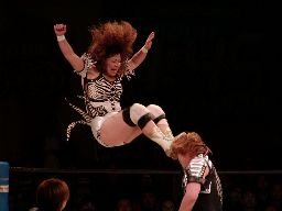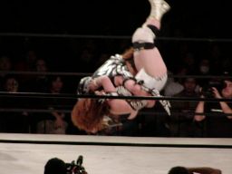 輝コーナーに振る、シュガー切り返してスプラッシュ、輝かわして串刺しニーアタック、シュガーキャッチしてライガーボム(左写真)、カウント2。里村にタッチ。
