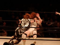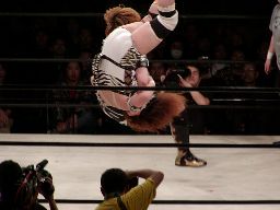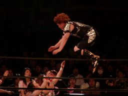シュガーロープに飛んで体当たり(右写真)、チョークスラム狙うが元気ブロック。