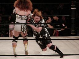 元気ロープに振ってラリアット、シュガーかわして体当たり(左写真)。シュガーコーナーに振って串刺しエルボー。シュガーロープに飛ぶ、元気カウンターのビッグブーツ。2発目シュガーはキャッチしてドラゴンスクリュー、里村にタッチ。