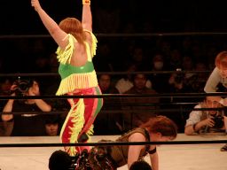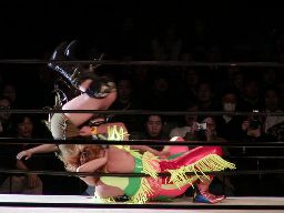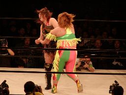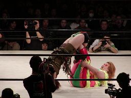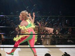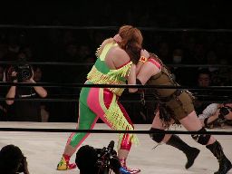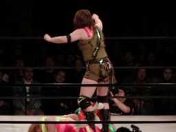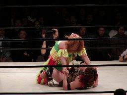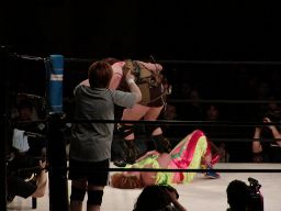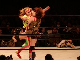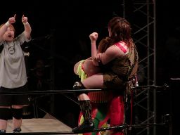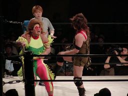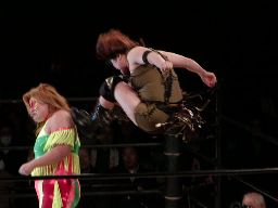 奈苗コーナーに上る、京子もセカンドコーナーに上りラリアットで叩き落す。奈苗は京子の背後に回ってジャーマン(左写真)。