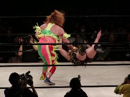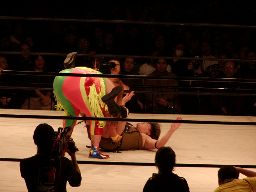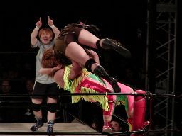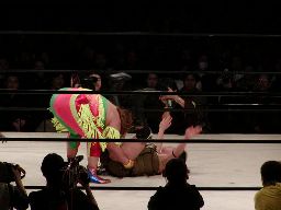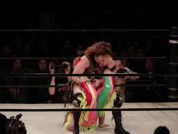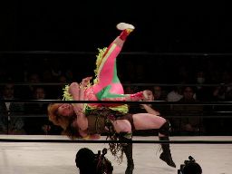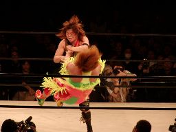 奈苗ロープにもたれる。京子は「ゲッツ!」ラリアット(左写真)。京子ブレーンバスターの体勢、奈苗ブロックして逆に投げる。10分経過。