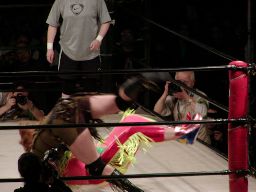 再度ロックアップ、今度は奈苗が押し込む、奈苗ブレーク間際にキック(右写真)。ロープに振る、京子切り返す、体当たりは双方互角。京子ラリアット、奈苗かわして体当たり、京子を吹っ飛ばす。