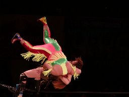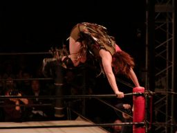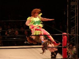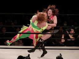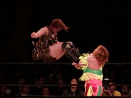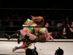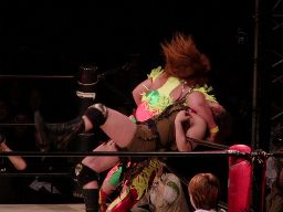 京子転がってエプロンに。奈苗追いかけてエプロンでブレーンバスター狙うがこれは京子が逆に投げる(右写真)。奈苗場外転落。しかし奈苗は京子を引きずり下ろすと場外でブレーンバスター。奈苗コーナーに上る、京子リングに戻る。