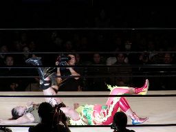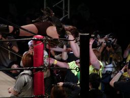 奈苗顔面キック連打、コーナーに上る、京子下から投げ落とし逆に上る、奈苗は場外に突き落としトペ・スイシーダ(右写真)。