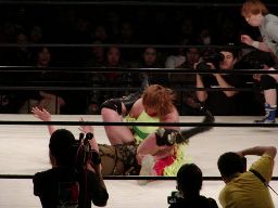 奈苗は京子を花道まで連れて行ってブレーンバスター(左写真)、階段から蹴り落とす。さらに階段からダイビングフットスタンプ、先にリングに戻る。京子はカウント15で戻る。奈苗カバー、カウント2。