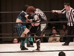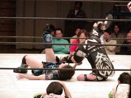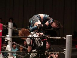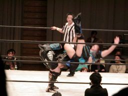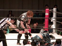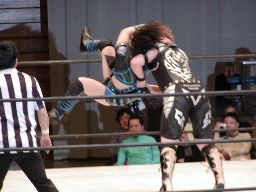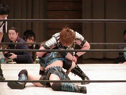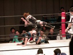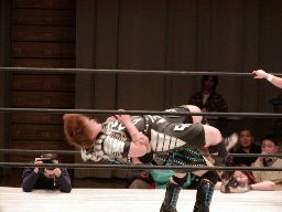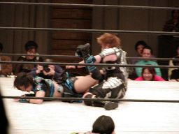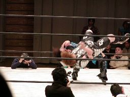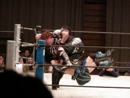 元気をコーナーに振る、田村コーナーに上って顔面蹴りまくる(右写真)。田村エルボー、元気エプロンに。田村三角絞め。元気場外に落ちるが田村は戻す。