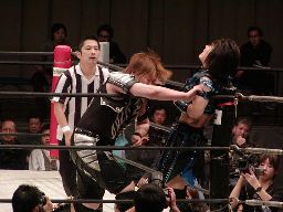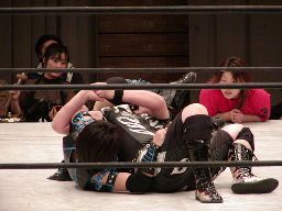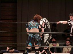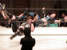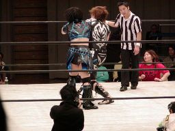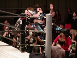 田村代わってコーナーに、元気捕まえてエプロン(場外?)へのパワーボム狙うが田村が抵抗したため両者同体で場外転落(左写真)。25分経過。