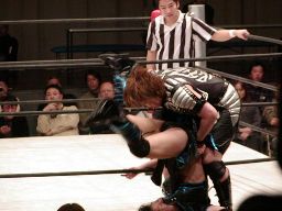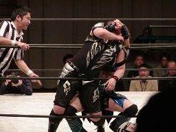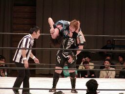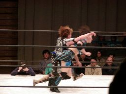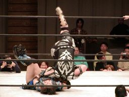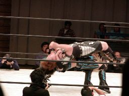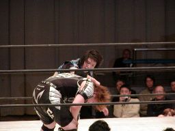 コーナーに上げて元気雪崩式肩車バックドロップ(右写真)。しかし田村は下から三角絞めに。元気ロープ。田村ネックロック、元気ノーザンライトスープレックスで投げるが田村は放さない。田村コーナーに振る、元気切り返す、田村回転エビ固め、カウント2。20分経過。