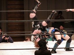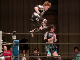 田村ゆりかもめ、元気ロープ。元気逆水平、田村エルボー、元気ラリアット。元気コーナーに上って片足ミサイルキック(左写真)、田村スカす。