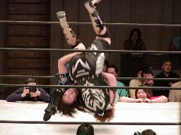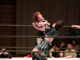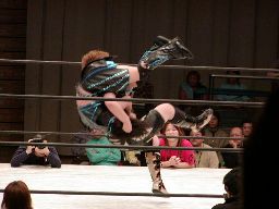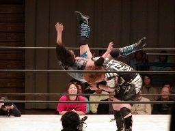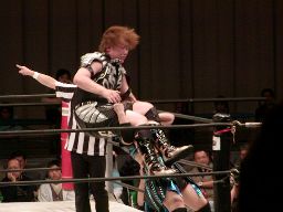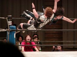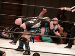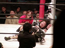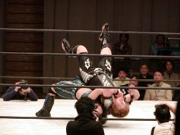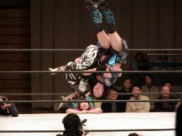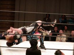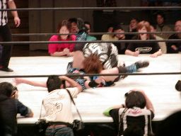 田村は元気をコーナーに上げて肩車式ダブルリストアームサルト(右写真)、この奥の手で決まるかと思われたが元気は2で返す。