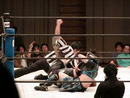元気ラ・マヒストラル、カウント2。外道クラッチ風エビ固め(左写真)もカウント2。