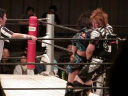 田村コーナーに上る、元気も上るが田村は雪崩式ノド輪落とし(右写真)、カウント2。