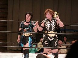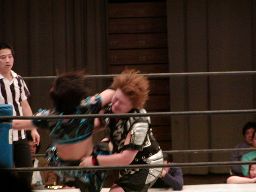 元気立ち上がってパワーボム(右写真)、田村が2で返した瞬間にタイムアップのゴング。