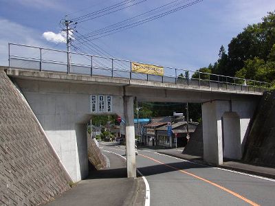 ![]() | 右に行けば姫だるま、という看板のある「例の陸橋」。JR豊肥本線玉来(たまらい)駅のすぐ近く。後藤姫だるま工房はここから約1.3km。看板のすぐ横の道を右に行くのではなく、ちょっと進んだところにあるガソリンスタンドから右に入っていく。 |