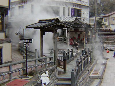 ![]() | ヘリで湯村温泉に移動した2人が入っていたのは湯村温泉・共同浴場の「薬師湯」。入浴料300円。 |