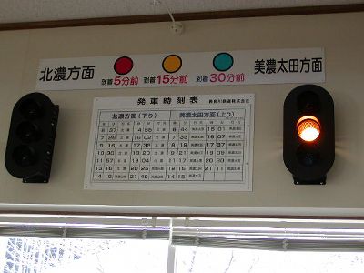 湯上りは休憩所でビールでも飲みながらゆったり。「地の物」がうどん以外にないのがちょっと残念。休憩所には列車の接近を知らせる信号が。赤(5分前)になったらホームに出ればよい。