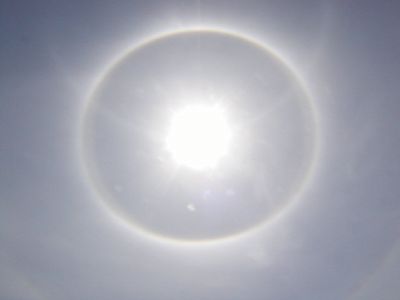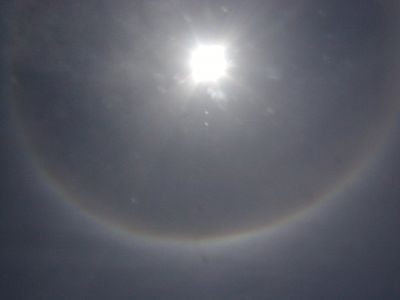 気づくと太陽の周りに虹のような光の輪。これってなんという自然現象だったっけ?(調べたら「暈(うん)」という現象で、そんなに珍しいものでもないらしい)