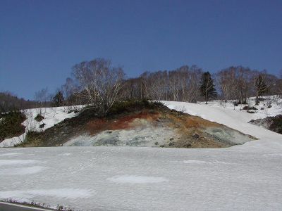 すぐには風呂に入らず、そのまま山道を上る。蒸気が出てるところはさすがに雪もない。