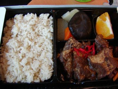 昼食は鹿児島中央駅の駅弁「とんこつ弁当」。めし、おかず、果物!とまことに九州らしい駅弁。栄養のバランスは?だが、土地のうまいものを食えると言う意味ではかなり高評価な駅弁である。