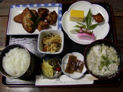飫肥城大手門の脇に「おび天」(飫肥のさつま揚げ)を出す店があったので入る。味噌汁はこれも飫肥名物「かに巻汁」、そして飫肥名物の厚焼き玉子も付いた「おび天定食」。結論:名物にうまいものなし!(というか観光地の食堂に、だな。)