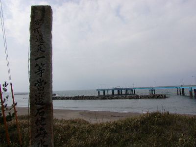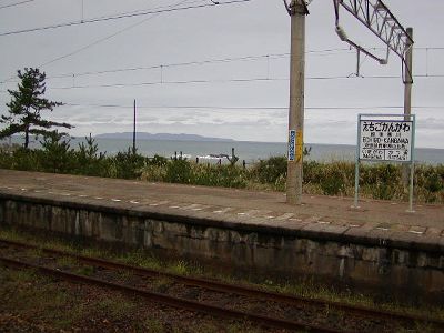 石地駅到着。目的は当然「どうでしょう」ロケ地巡り。番組でちらっと映った「日本海」という海の家をインターネットタウンページで検索して住所を突き止め、長岡からそこに行く道を調べたら途中で石地駅の近くを通過することがわかったのだ。つまりここが一応「最寄駅」。とはいえここからその海の家までは約5km。普通は歩いては行かない。実際駅にバスかタクシーあったら乗ろうかとも考えたが、そんなもの一切ない無人駅だった。