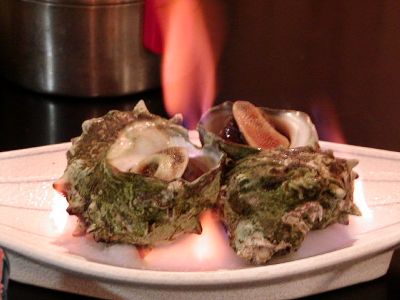 柏崎駅前の定食屋で昼飯。サザエのつぼ焼き。