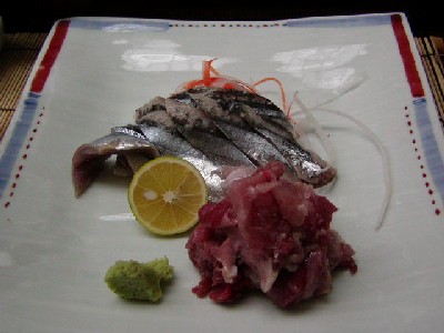 夜は夜でまた魚。今日も東横インおすすめの店「あわしま」。ここはその名の通り粟島の郷土料理の店(店主は粟島の旅館の次男)だそうだ。粟島といえば椎名誠が何度も訪ね何度も文章にしているとこ、これは行かずにはおれない。まずマグロのたたきとサンマの刺身。これは粟島とはあんまり関係ないかも。両方とも600円。