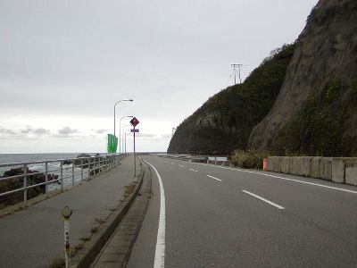 今日の予定は計画としては8時3分発の特急で村上まで行って村上城→ちょっと戻って新発田城→新潟に戻ってDDT、というはずだった。しかしこの天気の悪さ。夜のうちに計画を練り直し。城は天気の悪い時に行っても結局はまた行き直すことなる。特に新発田城は夏に一度行っており、今回は別時間帯(午前だと逆光だったので)の写真を目的としていたからこの天気では意味なし。ならば藤村イズム。村上よりさらに先に「原付東日本縦断」の「だるま屋ウィリー事件」の現場がある。しかし最寄の越後寒川駅からは約2km。しかも遅くとも10時50分ので帰ってこないとDDTが見れない(その後14時台まで電車なし)という本末転倒な事態になる。となると行きは6時8分の、ということに。東横インだから朝食は大したもん出ないしいいんだけど、その時間じゃあ駅弁も売ってない。で、起床は5時前。目覚まし掛けずに起きれた。6時に新潟駅に。やっぱり駅弁はない。仕方なくサンドイッチの朝食。越後寒川駅には7時59分の着。ここもやっぱり何もない駅だ。歩く。雨は降ってない。