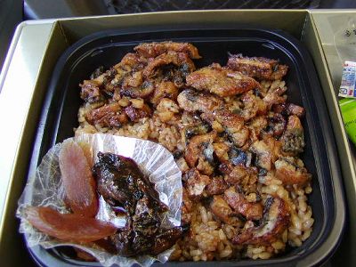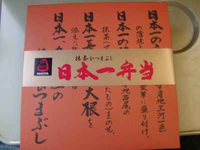 朝6時27分品川発ののぞみ41号で名古屋へ。名古屋駅で駅弁「抹茶ひつまぶし日本一弁当」購入。何が日本一かと言うと主役のひつまぶしではなく付いてる守口漬らしいが。