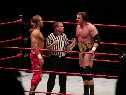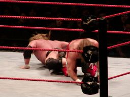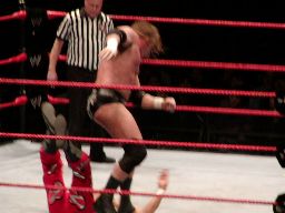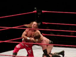 HHH立ち上がってロープに振ろうとするがショーン離さず。