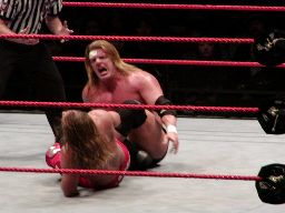 ショーンがヘッドロックからフライングメイヤーに。HHHヘッドシザーズでブレーク。